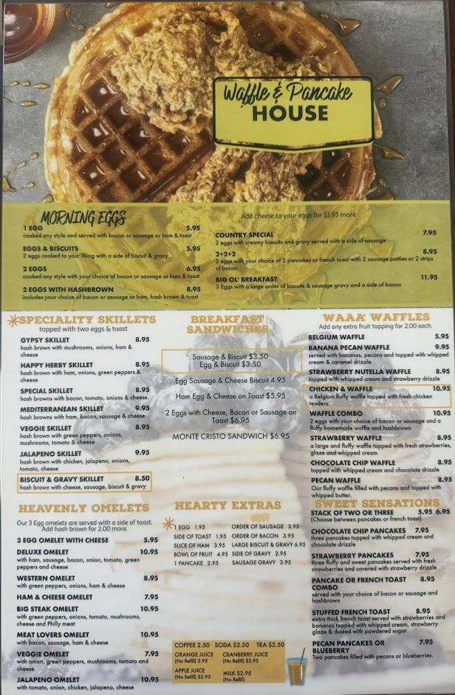 The menu at Waffle & Pancake House showcases a delightful assortment of breakfast and lunch items. From stacked pancakes to savory skillets, the choices are as inviting as they are delicious. Highlights include the Super Four Pancakes, known for their generous size and fluffy texture, perfect for starting the day. The Chicken & Waffle combination captures both sweet and savory elements, making it a must-try.